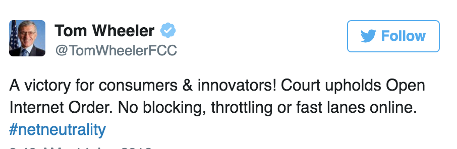 In a divided 2-1 decision, the U.S. Court of Appeals for the D.C. Circuit upheld the Federal Communications Commission's 2015 Open Internet, which "reclassified broadband service as a telecommunications service, subject to common carrier regulation under Title II of the Communications Act" like a phone service.  Based on that classification, the FCC subjected Internet providers to principles of net neutrality.  The decision is viewed as a major victory for President Obama and FCC Chairman Thomas Wheeler, as well as nonprofits and activists who champion a free and open Internet. Download the decision in U.S. Telecom Assn. v. FCC